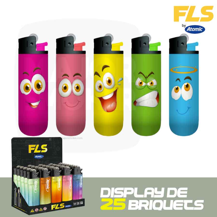 Le briquet FLS Funny Face en lot de 25 propose un assortiment de visuels cartoon sur des fonds rose, jaune, bleu et vert. L’ensemble offre une présentation variée et dynamique, idéale pour attirer l’œil en point de vente.