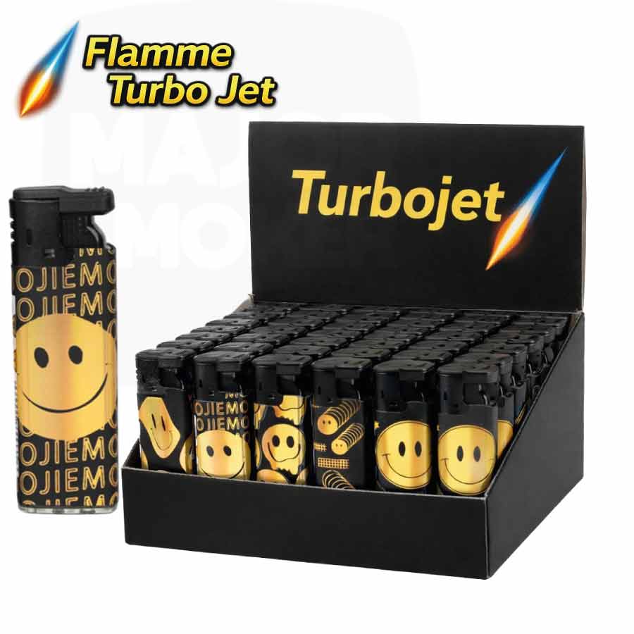 Le briquet Turbo Face Rubber en lot de 50 s’adresse à ceux qui recherchent un volume important tout en conservant une identité visuelle forte. Son design noir rehaussé de smileys dorés, étoiles et motifs graphiques crée un contraste net et reconnaissable. Doté d’un allumage électronique, il délivre une flamme torche réglable en largeur, dans un format fin et léger.