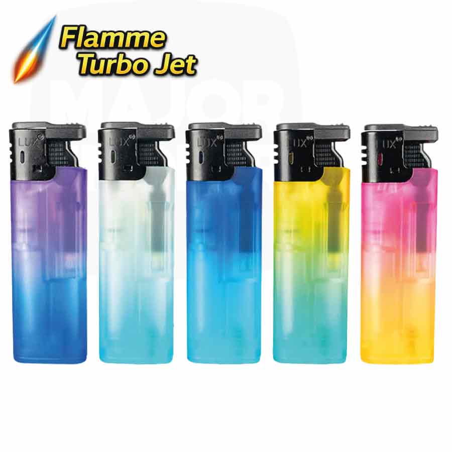Le briquet Turbo Rubber se caractérise par son design coloré et ses dégradés légèrement translucides, où chaque briquet présente une combinaison de couleurs différente. Selon les arrivages, les dégradés peuvent varier : violet vers bleu, blanc et bleu, bleu foncé vers bleu clair, jaune et bleu clair, ou encore rose et jaune. Le rendu visuel joue sur la transparence et les transitions de couleurs, rendant chaque briquet unique.