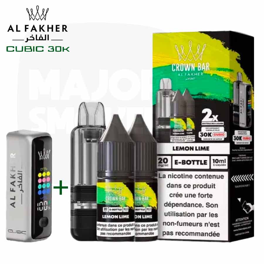 Le Kit Cubic 30K Al Fakher Lemon Lime associe une batterie intégrée de 800 mAh, une cartouche de 2 ml rechargeable et deux flacons de 10 ml d’e-liquide en sels de nicotine (20 mg/ml). Cette version propose une combinaison citron jaune et citron vert, intégrée dans la gamme Al Fakher puff qui se décline en plusieurs saveurs comme Berry Ice, Gum Mint ou Mango Pineapple.
