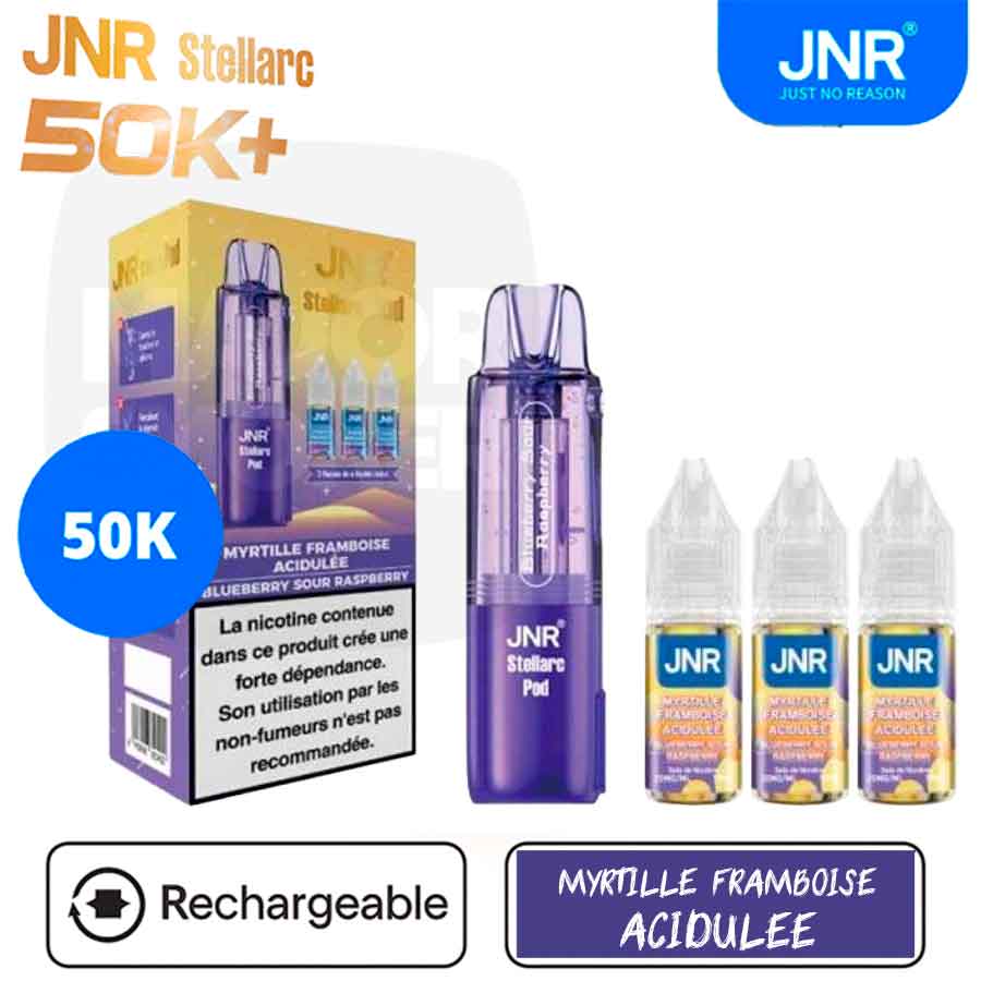 La cartouche Stellarc JNR Blueberry Sour Raspberry est compatible exclusivement avec la puff Stellarc de la marque jnr. Son profil aromatique associe la myrtille et la framboise, avec une orientation acidulée marquée sur la framboise. Elle est livrée avec trois fioles d’e-liquide jnr de 10 ml, en complément du réservoir de 2 ml intégré, remplissable par le côté. L’autonomie totale atteint jusqu’à 50 000 bouffées.