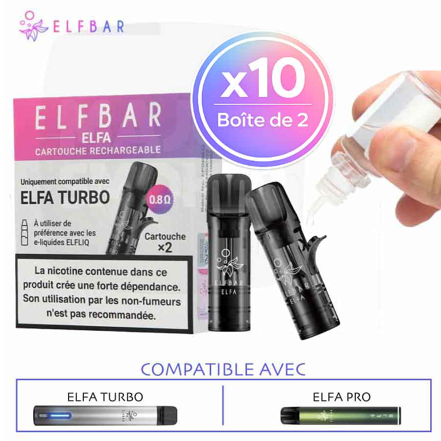 Ce lot regroupe 10 packs de 2 cartouches vides Elfa Turbo, soit 20 cartouches au total. Chaque cartouche est compatible avec les batteries elfbar elfa turbo et elfbar elfa pro. Elles permettent d’utiliser l’e-liquide de son choix, à condition que celui-ci ne dépasse pas un ratio de 50 % de glycérine végétale (VG). Les e-liquides à base d’huile ne sont pas compatibles.