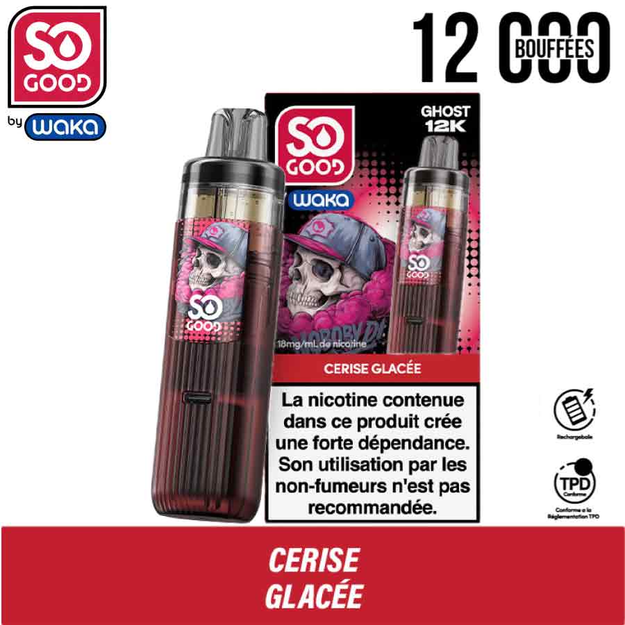 La Ghost 12K est une puff rechargeable 2en 1 conçue par So Good en collaboration avec WAKA. Elle repose sur un système à cartouche préremplie et batterie rechargeable. Le dispositif permet une utilisation prolongée sans remplissage manuel et limite les manipulations. Le kit inclut une recharge ghost préremplie composée de deux réservoirs intégrés (8 ml + 2 ml). L’ensemble permet d’atteindre jusqu’à 12 000 bouffées. La batterie intégrée alimente la cartouche ghost puis se recharge lorsque nécessaire. La couleur de la batterie varie selon la version choisie. Elle reste compatible avec les recharges Ghost. Selon la déclinaison, plusieurs saveurs existent dans la gamme, par exemple Menthe Fraiche, Myrtille Framboise Acidulée ou Fraise glacé. Ces versions partagent les mêmes caractéristiques et le même fonctionnement.