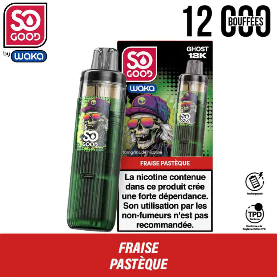 La Ghost 12K est une puff rechargeable 2en 1 conçue par So Good en collaboration avec WAKA. Elle repose sur un système à cartouche préremplie et batterie rechargeable. Le dispositif permet une utilisation prolongée sans remplissage manuel et limite les manipulations. Le kit inclut une recharge ghost préremplie composée de deux réservoirs intégrés (8 ml + 2 ml). L’ensemble permet d’atteindre jusqu’à 12 000 bouffées. La batterie intégrée alimente la cartouche ghost puis se recharge lorsque nécessaire. La couleur de la batterie varie selon la version choisie. Elle reste compatible avec les recharges Ghost. Selon la déclinaison, plusieurs saveurs existent dans la gamme, par exemple Fraise Glacée, Myrtille Framboise Gummy ou Myrtille Framboise acidulée. Ces versions partagent les mêmes caractéristiques et le même fonctionnement.
