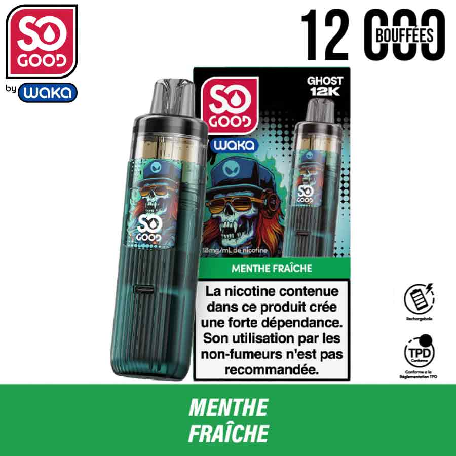 La Ghost 12K est une puff rechargeable 2en 1 conçue par So Good en collaboration avec WAKA. Elle repose sur un système à cartouche préremplie et batterie rechargeable. Le dispositif permet une utilisation prolongée sans remplissage manuel et limite les manipulations. Le kit inclut une recharge ghost préremplie composée de deux réservoirs intégrés (8 ml + 2 ml). L’ensemble permet d’atteindre jusqu’à 12 000 bouffées. La batterie intégrée alimente la cartouche ghost puis se recharge lorsque nécessaire. La couleur de la batterie varie selon la version choisie. Elle reste compatible avec les recharges Ghost. Selon la déclinaison, plusieurs saveurs existent dans la gamme, par exemple Fruits Rouges, Cerise glacée ou Fraise Pastèque. Ces versions partagent les mêmes caractéristiques et le même fonctionnement.
