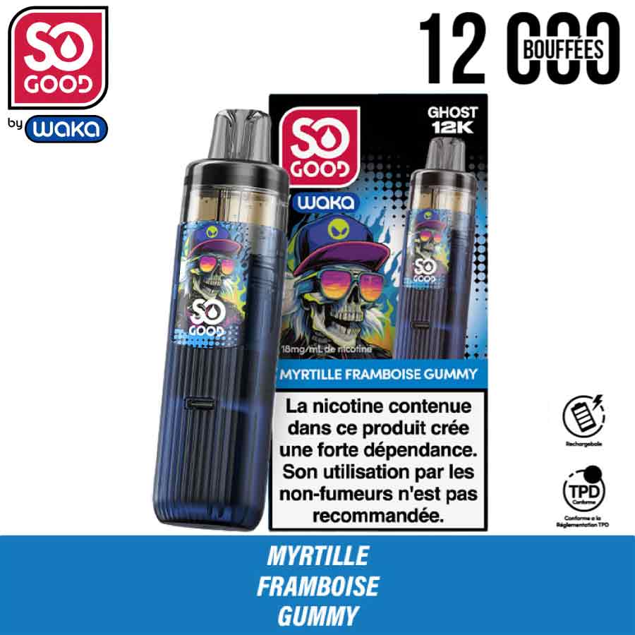 La Ghost 12K est une puff rechargeable 2en 1 conçue par So Good en collaboration avec WAKA. Elle repose sur un système à cartouche préremplie et batterie rechargeable. Le dispositif permet une utilisation prolongée sans remplissage manuel et limite les manipulations. Le kit inclut une recharge ghost préremplie composée de deux réservoirs intégrés (8 ml + 2 ml). L’ensemble permet d’atteindre jusqu’à 12 000 bouffées. La batterie intégrée alimente la cartouche ghost puis se recharge lorsque nécessaire. La couleur de la batterie varie selon la version choisie. Elle reste compatible avec les recharges Ghost. Selon la déclinaison, plusieurs saveurs existent dans la gamme, par exemple Myrtille Framboise Acidulée, Pastèque ou Bubble gum raisin. Ces versions partagent les mêmes caractéristiques et le même fonctionnement.